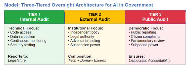 This distinction sits at the heart of what Rao calls the Three-Layer Governance Architecture. In this approach, AI is kept to the structured, repeatable tasks scoring bids, verifying compliance, and flagging red flags. Humans remain responsible for the areas that require judgment, context, and ethical reasoning, such as political trade-offs or strategic decisions. Above both lies the accountability layer: independent auditors with the authority and expertise to ensure the system stays transparent, fair, and free from hidden bias.