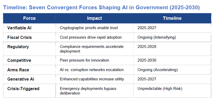 Looking forward, Rao argues that the adoption of AI in government is inevitable, driven by seven converging forces. Advances in verifiable AI will reduce the trust gap by allowing systems to prove their reasoning cryptographically. Fiscal pressures will push governments to automate, while regulatory clarity, paradoxically, will accelerate adoption by lowering institutional risk. Competitive pressure will ensure no country wants to appear technologically behind.